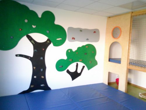 Im Klettergarten kann geturnt und geklettert werden. Große Schaumgummielemente laden zum Bauen und Bewegen ein